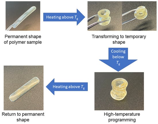 Polymers B1 and B4 demonstrated thermo-responsive shape-memory properties, which were determined by Tg [37]. These polymers were composed of macromolecules with hard and soft fragments. Soft aliphatic chains act as switchable units that allow the polymer to change its shape [38]. These polymer samples were able to obtain a temporary shape and maintain it when the temperature was lower than their Tg. To demonstrate these properties, the polymer samples were heated above their glass transition temperature, and then, deformed to the desired temporary shape, in this case, a roll. When the temporary shapes were obtained, they were fixed by cooling the polymer samples below their Tg. The temporary shapes did not change over time while the samples were kept at a temperature below their Tg. The ability of the samples to return to their permanent shape was verified by heating them above their Tg. Polymers B1 and B4 were able to return to their permanent shapes in a short period of time, 5 s. The heating–cooling–heating cycle scheme of the polymer B1 sample is presented in Figure 7.