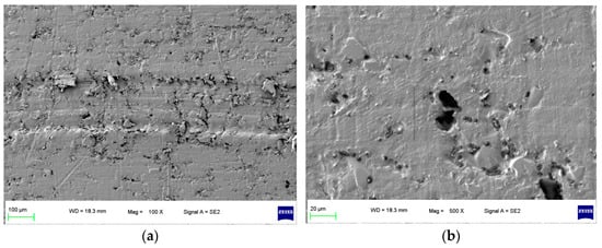 Surface morphology of the specimen with compressed hydrogen medium in long-term wear. (a) 100× and (b) 500×.
