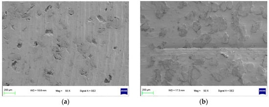 It can be seen from Figure 2a that the surface of the unworn specimen of a 10%PEEK/PTFE composite was smooth, and there were some tiny pores inside the specimen because of the mixing and sintering in the preparation process. After the corrosion microwear test by the friction pair of the QT 450, the test conditions were dry friction without lubrication, a 200 N load and a frequency of 2 Hz. The test time was 0.5 h, the reciprocating distance was 10 mm and the speed was 0.04 m/s. From Figure 2b of the worn specimen without the compression medium, although the specimen surface has some wear marks, the specimen surface pores were filled by the grinding process. Therefore, without hydrogen penetration, the surface micromorphology of the composite material presented irregular small holes, and the wear surface was relatively smooth and flat. The composite material showed graphene wear resistance.