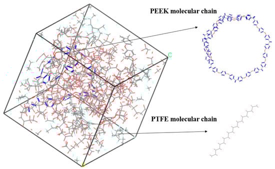 The amorphous molecular model of the PEEK/PTFE composites was built by a molecular dynamic software, Materials Studio 8.0. The cubic crystal lattice can be constructed by the packing and construction functions. But considering the calculation amount and efficiency during simulation, in the amorphous cell module, based on the Monte Carlo method, through the calculation of a “random number”, when selecting the packing function in the build module, the base density was set to 1.9 g/cm3 [12], the Mole Ratio of the PTFE and PEEK was 26:1, and the Weight% was 90:10. The PTFE chain and PEEK chain were constructed into a lattice to form the required amorphous polymer composite material model, and the volume of the periodic cubic lattice was 3 nm × 3 nm × 3 nm. The force field used to build the model was the Compass II force field, which was suitable for the molecular model construction and performance simulation and the calculation of the composite materials. The calculation of the electrostatic force was carried out by the Ewald method, and the calculation of the van der Waals force was carried out by the Atom-based method. The truncated radius was set to 1.2 nm, as shown in Figure 3.