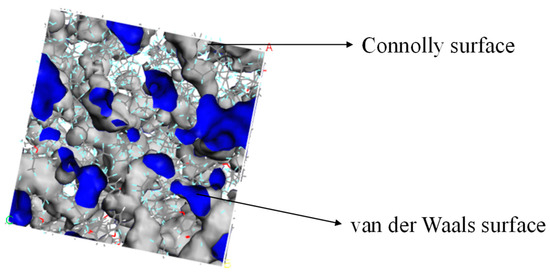 The Atom Volumes and Surfaces in MS was used to calculate the free volume and distribution of the established PEEK/PTFE composites. The probe molecule with a certain radius was set to roll along the PEEK/PTFE composites’ surface. The surface formed by the contact point connection was a Connolly surface. The space enclosed by the so-called Connolly surface was the free volume of the PEEK/PTFE composites. According to the size of the hydrogen molecule (the van der Waals radius was 0.12 nm), the Connolly radius was set as 0.12 nm, and the free volume (FFV) distribution diagram of the PEEK/PTFE composites is shown in Figure 4 (blue is the Connolly surface, and gray is the van der Waals surface). The ratio of the free volume to the total volume of the simulation box was the FFV of the system, in which the FFV of the PEEK/PTFE composites accounts for 21.8%. It can be seen that there was a large free space for the diffusion and transition of hydrogen gas molecules in the PEEK/PTFE composites along the space gap.