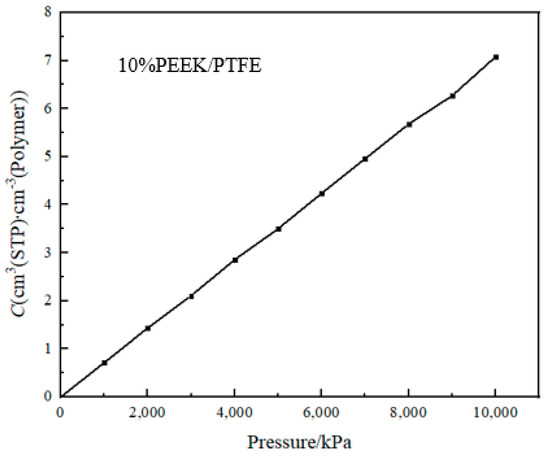 The solubility coefficient (S) reflected the thermodynamic characteristics of the interaction between the permeated gas molecules and the PEEK/PTFE composite materials [18]. It can be calculated by the giant canonical Monte Carlo method (GCMC). The periodic boundary condition was set; the balance steps were set for 100,000 steps; the output steps were set for 300,000 steps; the step size was intercalated for 500 ps; and the temperature was intercalated at 298 K. The simulation graphene was Metropolis, the hydrogen was selected as the osmotic molecule, the pressure change range was 10~10,000 kPa (determined by the working range of the hydrogen compressor) and the force field was a Compass II force field. The adsorption isotherm curve of the hydrogen molecule in the composite molecular model obtained by the simulation is shown in Figure 5.