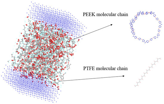 In order to make the model more in line with the actual situation, the overall minimum energy configuration should be obtained. Using the Geometry Optimization function in the Forcite module of a commercial software—Materials Studio 8.0—the 10% PEEK/PTFE composite model was geometrically optimized by the smart method. The convergence boundary of energy was set to 10−5 kJ/mol, and the convergence boundary of force was set to 10−2 kJ/(mol/nm). The conjugate gradient method was used to find the lowest energy point until the overall system of the 10% PEEK/PTFE composite model reached the set equilibrium standard.