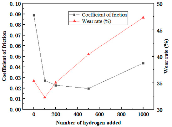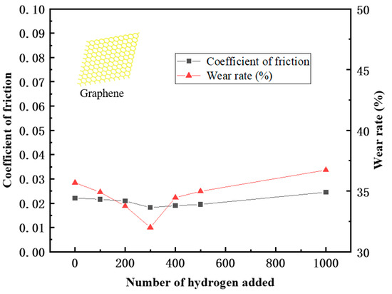 After the frictional simulation, the friction coefficient and wear rate of the PEEK/PTFE composites filled with different numbers for the hydrogen gas were calculated through the data obtained from the simulation. The simulation results are shown in Table 2 and Figure 9. The wear rate was defined as the ratio of the total number of atoms shed during the shear process to the total number of atoms.