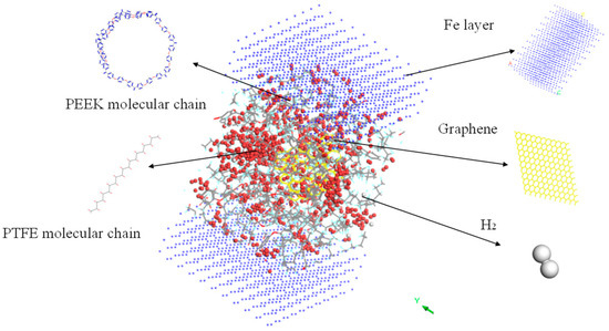 First, the upper and lower Fe atom layers required for contra grinding were established and then the Fe atom layer and PEEK/PTFE composites were filled with gas molecules, which were stacked by the Build Layers module to form a frictional model of Fe and PEEK/PTFE composites, as shown in Figure 7 (the model with 500 for the hydrogen added was taken as an example, and the spherical substance (red) in the figure is the hydrogen molecule). Then, the final relaxed model was obtained by being subjected to geometric optimizations, annealing and dynamic simulations (the same method as introduced in Section 2.2). The model was subjected to shear simulations by the Confined Shear function in the Forcite module. The force field was selected as the Compass II force field; the Fe layer speed was set to 0.1 A/ps; the total simulation time was set to 500 ps; the number of steps was 500,000; and 5000 steps were output per frame. The sheared model is shown in Figure 8 (taking 500 for the hydrogen as an example).