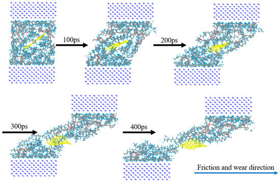 Through the MDs simulations, the friction coefficient and wear rate of the PEEK/PTFE composites filled with 3% graphene were calculated. The simulation results are shown in Table 3 and Figure 13. The wear rate was defined as the ratio of the total number of atoms dropped during shearing to the total number of atoms.
