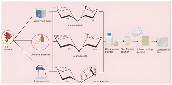 Carrageenan is a natural biopolymer derived from red algae and is a hydrophilic polysaccharide [17,18]. Carrageenan is a food-grade polymer commonly used in the food sector [19]. Recently, the production of biodegradable and sustainable packaging films has gained much attention [20,21]. The structural and functional properties of biopolymer-based films are due to their distinct and unique structures. Therefore, it is important to examine the structural characteristics of carrageenan before applying it to food packaging. Carrageenan belongs to the group of linear polysaccharides that have sulfur groups in their chains. Polysaccharides mainly consist of galactose (3,6-anhydride-galactose and D-galactose) and ester sulfates, both of which make up the structural backbone [8,22]. Lambda (λ), kappa (κ), and iota (i) are the three main types of carrageenans and are distinguished by the sulfate group present in the repeat unit [14]. Among the three types of carrageenan, kappa carrageenan is the most popular and widely used due to its high gel-forming ability, followed by iota and lambda [23,24,25,26,27]. All three carrageenans are insoluble in organic solvents but soluble in water, depending on the arrangement of the sulfate groups in the chain [12].