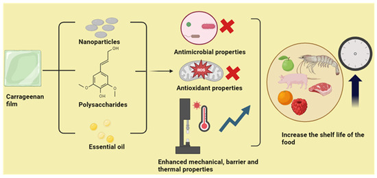 Active packaging is the intentional addition of substances to the packaging material or the headspace of the packaging material to improve the functional performance index of the packaging material and thereby increase the shelf life of the food product. These substances act on food ingredients or are slowly released into the food system, where they interact with the food and induce positive changes in the food system [87,88]. As previously pointed out, carrageenan can be used as an excellent source to synthesize modified packaging films that can produce beneficial effects through active packaging systems.
