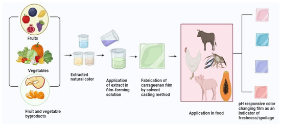 Zhang et al. [112] added mulberry polyphenol extract to films synthesized with carrageenan, which were then synthesized by solvent casting. When the polyphenol extract is initially added to the film, the film appears dark blue, which may be due to the reaction of anthocyanins and carrageenan present in the mulberry polyphenol extract. Mulberry extract is added to FFS using a solvent-casting method. Variation in the extract concentration was used to study the effect of extract concentration on the color change in the film. As mentioned earlier, milk is used to study the effects of mulberry extract to detect the changing state of milk. When milk spoils, the activity of lactic acid bacteria naturally present in milk is enhanced, and lactic acid accumulates, which can naturally reduce the pH of milk below 7, making it acidic. When milk is applied, the film turns purple. After the milk is stored at 40 °C for 6 h (i.e., the typical time for milk to spoil), the milk becomes acidic, which is indicated by a color change in the film. The film, which was initially purple, turns pink, indicating decay. Therefore, carrageenan films combined with mulberry polyphenol extract can be used as a powerful system for intelligent packaging applications. Similar work on carrageenan-based intelligent packaging results showed it has good potential as a food freshness sensing application [113,114,115]. Some of the other studies on the application of modified carrageenan films into intelligent packaging systems are presented in Table 2. In most systems, the LAB color system is used to display colors. The application of carrageenan in smart food packaging is shown in Figure 3.
