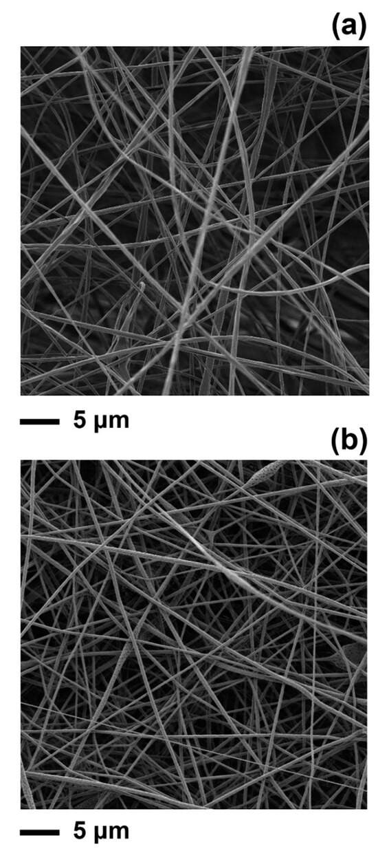 The PLA and PLA–limonene fibres of this work were electrospun from acetone at a polymer concentration of 14 w/v%. The PLA–acetone solution was selected because it enabled the electrospinning of fibres with a consistent, bead-free morphology (Figure 1), as shown in previous studies [3,9,10]. Limonene was mixed with the PLA–acetone solution, prior to electrospinning, at a concentration of 10 v/v%. As previously demonstrated [10], this concentration of EO can be added to PLA solutions without negatively impacting on the stability of the liquid jet during electrospinning and, therefore, on the morphology of the fibres.