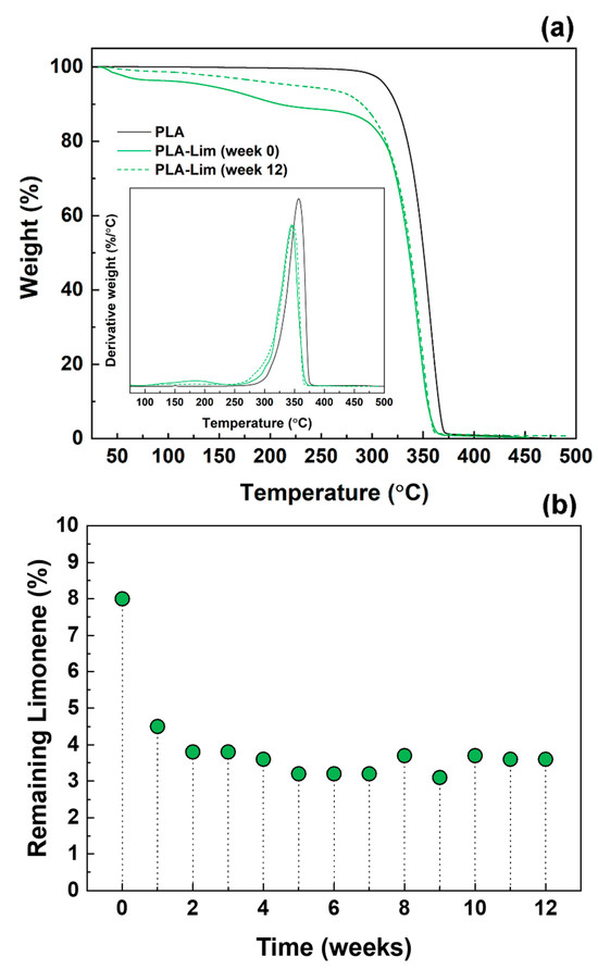 PLA–limonene fibres, which were analysed immediately after preparation (week 0), exhibited a first stage of weight loss below 100 °C. This can be attributed to the evaporation of the residual solvent and moisture entrapped into the electrospun mat [37,38] and possibly the traces of limonene present on the surface of the fibres. The second stage of degradation, where a high rate of weight loss was observed (peak in the first derivative curve), was at 183 °C, which is not visible in the curve of PLA fibres and corresponds to the degradation of limonene encapsulated into the electrospun fibres. Free limonene, instead, exhibited a one-step mass loss with a maximum temperature of 89 °C and it completely degraded above 100 °C, concordant with the literature [18]. The encapsulation of limonene into the electrospun fibres prevented evaporation, retaining limonene within the electrospun PLA fibres. Previous reports have noted that the encapsulation of essential oils within electrospun fibre improved their thermal stability [39,40]. For example, the degradation temperature of oregano essential oil was increased from 195 °C to 338–358 °C after encapsulation in chitosan nanoparticles [29]; similarly, the carvacrol contained in chitosan nanoparticles degraded at 340 °C, rather than at 186 °C as free carvacrol did [41].
