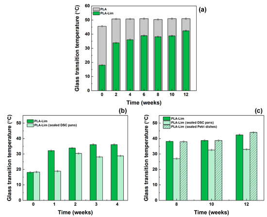 Glass transition temperature values at different time points for: (a) PLA fibres (grey histograms) and PLA–limonene fibres (green histograms) after storage under normal conditions (unsealed containers); (b) PLA–limonene fibres stored in normal conditions and PLA–limonene fibres stored in sealed DSC pans (light green histograms); (c) PLA–limonene fibres stored in normal conditions, PLA–limonene fibres stored in sealed DSC pans and PLA–limonene fibres stored in a sealed Petri dish (light-green, patterned histograms).