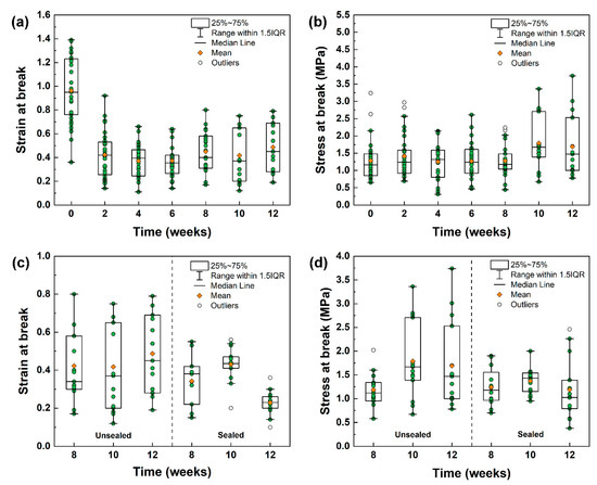 Box plots of (a) strain at break and (b) stress at break for PLA–limonene fibres stored under normal conditions for 12 weeks. Comparison between (c) strain at break and (d) stress at break for PLA–limonene fibres stored under normal conditions (unsealed, box plot on the left-hand side) and inside sealed Petri dishes (sealed, box plot on the right-hand side) for weeks 8, 10 and 12. The green symbols represent the individual measurements (repeats). Maximum and minimum values within 1.5 interquartile range (IQR) are indicated by the whiskers; lower and upper ends of the boxes represent the 25th and 75th percentile, while the middle line represents the median.