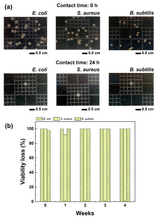 As discussed so far, the properties (thermal and mechanical) of PLA electrospun fibres containing limonene evolved over time depending on the storage conditions and duration, primarily due to the release of limonene. Despite this, the amount of limonene retained by the fibres was sufficient to impart antibacterial activity to the electrospun mats, against the following model microorganisms: E. coli, S. aureus and B. subtilis. As shown in Figure 5a, when the microorganisms were exposed to the PLA–limonene fibres for 24 h, no bacteria colonies were detected (clear agar gel plates), in contrast to the PLA samples which instead had no inhibitory effect, see Figure S5. Storage time had no impact on the antibacterial activity of the samples (Figure 5b), and the PLA–limonene fibres stored for 4 weeks before testing were as effective as the freshly prepared samples (week 0). The timepoint of 4 weeks was chosen because, from TGA and DSC measurements, it emerged that the properties of the fibres stabilised after 3 weeks of storage, indicating that the limited evaporation of the entrapped limonene occurred after that period of time.