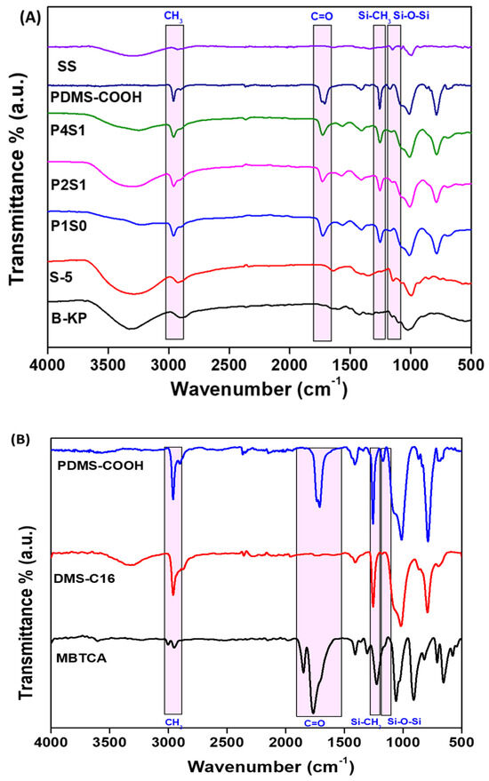 (A) FTIR spectra of blank kraft paper (B-KP), modified coated paper samples, and solid materials used for coating, including PDMS-CCOOH and solid starch (SS). (B) FTIR spectra of starting materials, meso-butane-1,2,3,4-tetracarboxylic dianhydride (MBTCA), carbinol (hydroxyl)-terminated polydimethylsiloxane 50–65 cSt (DMS-C16), and PDMS-functionalized carboxylates (PDMS-COOH).