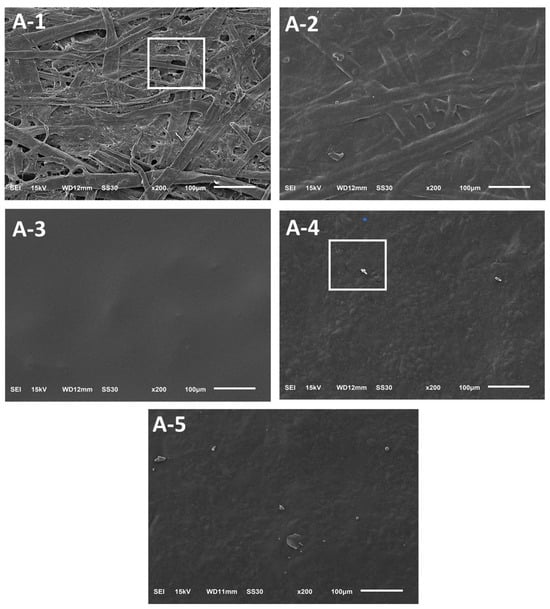SEM images (200×) of (A-1) blank kraft paper (B-KP), (A-2) 5% starch-coated paper 5-S, (A-3) P1S0, (A-4) P2S1, and (A-5) P4S1. The bar scale shows 100 µm, The area in white boxes shows the pores and cracks present on paper surface. EDX spectra of blank kraft paper (B-1) and P4S1 (B-2).