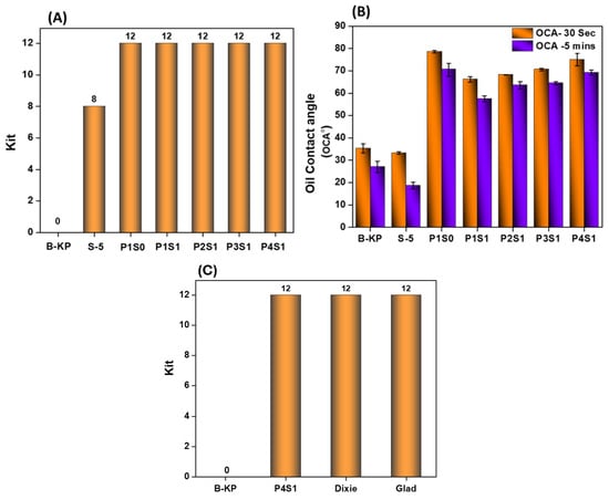 Figure 6A shows the kit test values of paper samples, showing the oil resistance of coated paper samples in contrast to B-KP, indicating that oil resistance has improved from 0 (failure of kit number 1 is considered as zero) to kit number 12. The kit numbers are assigned based on the kit solutions passed by a sample (leaving no darkness on application). These solutions are numbered from 1–12, which vary in ratios of castor oil, toluene, and n-heptane. The higher the kit number possessed by a sample, the better the oil resistance associated with it. The result revealed that B-KP absorbed oil quickly and showed a kit rating of 0 (as it failed the test performed by the liquid with the lowest kit number of 1), while the application of starch (to obtain S-5) caused the kit rating to increase to 8. The application of the PDMS-COOH coating layer further enhanced the oil resistance up to a kit number of 12, which corresponds to the highest oil resistance on this scale. Compared to our previously reported coated paper samples [1] that were prepared using CHI-g-PDMS and which exhibited a kit rating of 11, this coated paper showed an increase in its kit rating up to 12. The result shows that PDMS-COOH-coated paper possesses excellent oil resistance.