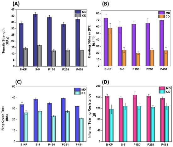 Tensile strength (A), bending stiffness (B), ring crush test (C), and internal tearing resistance (D) of blank kraft paper and coated paper samples.