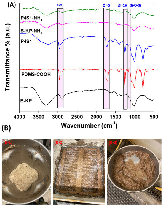 (A) FTIR spectra of recycled paper samples, which included blank kraft paper (B-KP), recycled B-KP that had been washed with NH4HCO3 (B-KP-NH4), recycled paper P4S1 that had been washed with NH4HCO3, and PDMS-COOH solid material. (B) The sample P1S0 after repulping (B-1), screen-rejected material of P1S0-coated paper (B-2), and screen-accepted material of P1S0 (B-3).