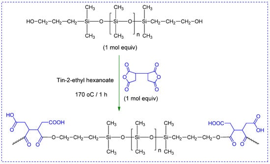 A single-neck round-bottle flask was charged with DMS-C16 (1 mole equiv., 70 g), MBTCA (1 mole equiv., 16.31 g), and tin-2-ethylhexanoate (0.5 wt% with respect to PDMS). The resultant mixture was stirred at 170 °C for 1 h under an ambient atmosphere to obtain the desired product PDMS-COOH without using any solvent. In the beginning, the reaction mixture was completely liquid, and the viscosity started to increase with time. After 30 min, the reaction mixture was too viscous, and the reaction continued for a further 30 min. Based on the 1H-NMR spectrum, the reaction conversion was 97%.