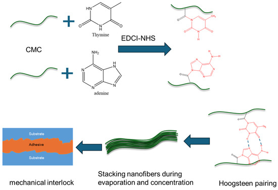 In the composition of the bonding strength between the adhesive and the substrate, in addition to the adhesive force contributed by the interaction, the mechanical interlocking generated by structural coupling is also especially important. Cellulose nanofibers can form structural bonds on the surface of the substrate, and their high modulus may contribute to stronger mechanical interlocking. Modulating the rigidity of the molecular chain can balance the adhesive effect and mechanical interlocking, and even form anisotropic adhesive effects based on the assembled structure. This interesting mechanism has great potential for application. Currently, CMC nanofibers are obtained by the high-pressure homogenization of carboxylate cellulose [29] or by doping PVA, as well as other electrostatic spinning processes [30]. However, their excessive cost and less environmentally friendly process hinder the large-scale preparation and application of CMC nanofiber adhesives to a certain extent. Therefore, we propose a method based on the pairing behavior of base pairs [31] and their different aggregation behaviors in water by modifying adenine and thymine on the surface of CMC and allowing them to self-assemble in water to obtain CMC nanofibers from the bottom up.