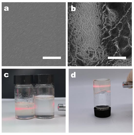 SEM image of membrane: (a) CMC AND (b) CMC-AT; the white scale bar in the figure is 1 μm. Images of aqueous solutions: (c) Tyndall effect of 2 wt.% CMC on the right and CMC-AT on the left; (d) inverted 2 wt.% CMC-AT.