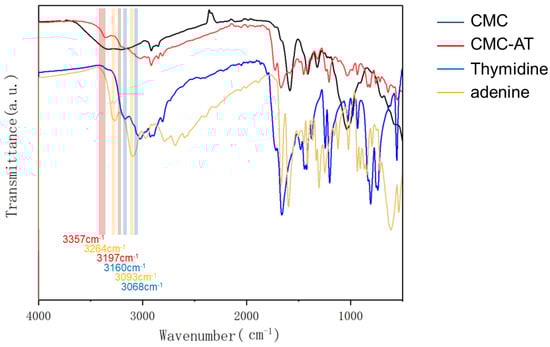 FTIR spectra of CMC, CMC-AT, thymidine, and adenine.