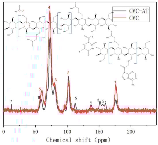 Although CMC can be dissolved in water, CMC-AT modified with adenine and thymine and nanostructured is insoluble in common solvents such as water, dilute acid, DMSO, and acetone. Therefore, its solid-state carbon magnetic resonance spectra were characterized and analyzed. The typical characteristic peak of the carboxyl carbon chemical shift of CMC is 176 ppm, and the peak intensity of this chemical shift significantly decreases after the reaction (Figure 4, red peak No. 1). This proves that the carboxyl group underwent a chemical reaction. The chemical shift of the ethyl carbon attached to it moved from 60 ppm to 58 ppm, indicating a decrease in the degree of shielding of the electron-withdrawing group. This may be due to the reaction between the carboxyl group and the secondary amines on the adenine ring of the conjugated structure, forming a larger conjugated structure and increasing resonance. This not only reduced the deshelling of the carbonyl carbon to move to a high field of 161 ppm, but also caused the ethyl carbon attached to it to move 2 ppm to a high field. The carboxyl group on CMC reacts with the secondary amine on adenine to form a tertiary amide structure. The carboxyl group on CMC reacts with the secondary amine on thymine between the methyl and carbonyl groups to form a dendritic amide structure. The chemical shifts corresponding to the five carbons on adenine are 155.3, 152.37, 151.3, 139.29, and 117.61 ppm, respectively [43]. The chemical shifts corresponding to the five carbons on thymine are 163.91, 151.34, 141.93, 107.19, and 12.51 ppm, respectively [44]. Due to the small number of hydrogen atoms on the ring, the signal is not as strong as that of the carbon atoms on the CMC chain. After the reaction, the formation of amide groups extends the conjugated structure, causing a slight shift to higher fields. The chemical shift of the amide carbon is close to that of one of the carbon groups on the thymine ring. These groups are close and inevitably form continuous peaks due to the resolution of solid-state nuclear magnetic resonance.