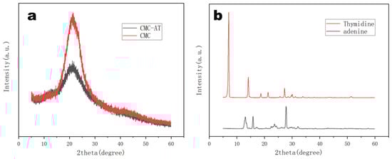 X-ray diffraction (XRD) spectra of (a) CMC, CMC-AT, (b)thymidine, and adenine.