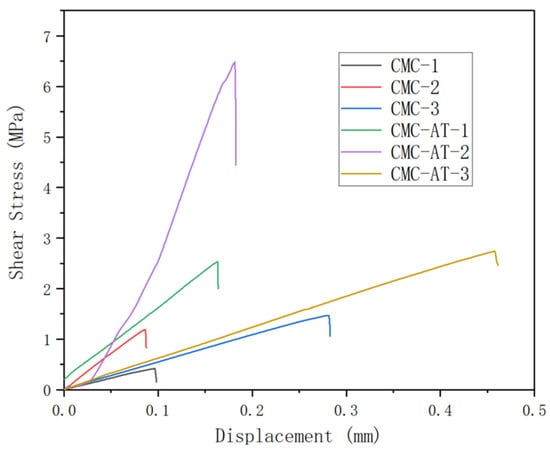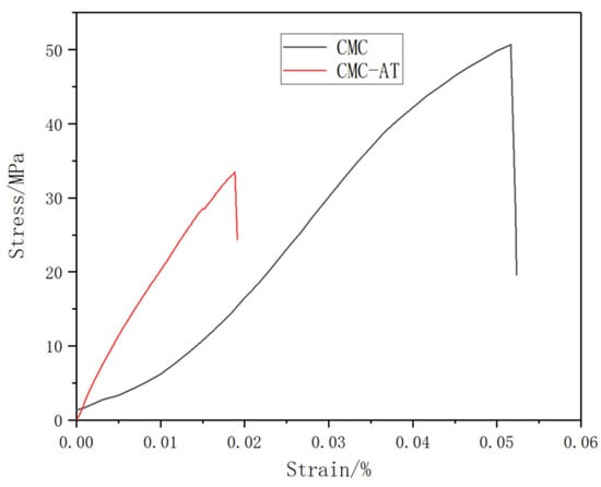 The mass concentration of 2 wt.% CMC and CMC-AT were directly dried at 60 °C for 24 h to form a film, and then the film was placed in a vacuum drying oven at 50 °C for 24 h to completely remove free water. The test results showed that (Figure 6) the tensile strength of the CMC film was 50.68 MPa, while the elastic modulus was 1.41 GPa. The tensile strength of CMC-AT was 33.49 MPa, and the elastic modulus was 2.51 GPa. CMC-AT had lower tensile strength than CMC, but a significantly higher modulus, due to its less compact structure. As an adhesive, mechanical interlocking is a vital component of adhesive strength, and a higher modulus leads to less deformation, thus enhancing this effect.