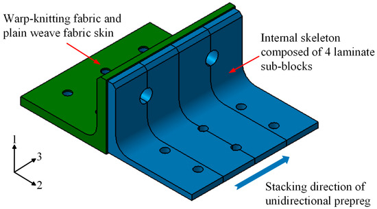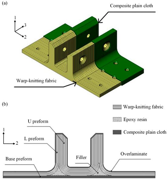 Some studies have found that under bending loads, the primary failure mode of composite T-joints is interlaminar delamination at the R-corner area [10,11,12,13]. Cheng et al. [14,15] investigated the bending performance of a novel configuration composite π-joint. As shown in Figure 1, compared to the conventional π-joint [16], this novel configuration lays the warp-knitted fabric along direction 3, which converts the interlaminar load of the plies at the R-corner area into an in-plane load. Experimental results indicate that compared to a conventional joint of the same size, the ultimate bending load of the novel configuration joint increases by nearly two-fold. It can be seen that converting the interlaminar load into an in-plane load can significantly enhance the load-carrying capacity of composite joints.