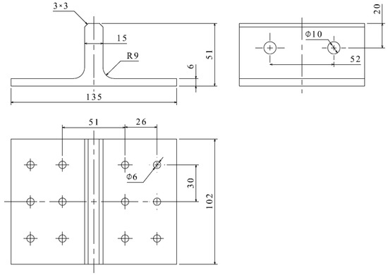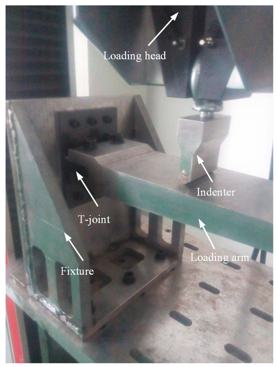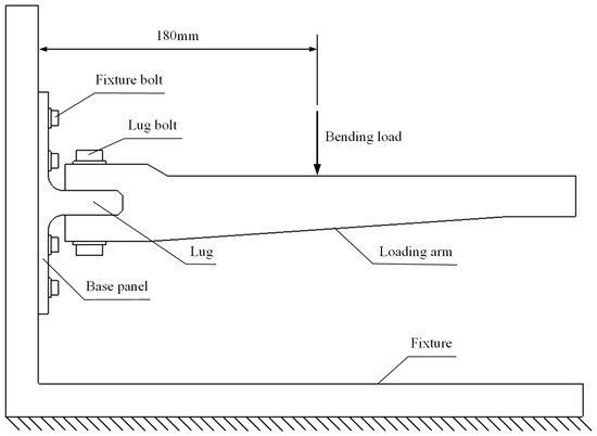 The loading scheme is depicted in Figure 5. The base panel is secured to the L-shaped fixture using twelve steel bolts with a diameter of 6 mm. The loading arm is connected to the lug using two steel bolts with a diameter of 10 mm. The distance between the loading point and the bottom surface of the joint is 180 mm. The experimental setup is illustrated in Figure 6. The L-shaped fixture is fixed on the test platform and reinforced with rib plates welded on both sides to provide sufficient bending stiffness. The load is applied downward by the indenter connected to the loading head of the INSTRON 8801 test machine (Norwood, MA, USA) with a speed of 0.5 mm/min, exerting bending load on the joint. The load and displacement of the indenter are recorded in real time by the sensors of the testing machine. The materials for the L-shaped fixture, loading arm, and indenter are all 45# steel. The properties of 45# steel are listed in Table 3.