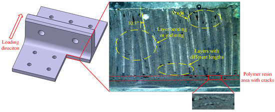 The post-test damage morphologies are depicted in Figure 7. The visible damage to the composite bolted T-joint includes cracks around the holes on the base panel, the separation of the skin and skeleton, and cracks along the thickness direction of the skeleton at the R-corner area. As shown in Figure 8 and Figure 9, the cross-sectional view of the R-corner area after the test reveals the presence of a polymer resin area with a non-negligible thickness between the skin and skeleton, with noticeable cracks within this resin area, while no significant delamination is observed in the skin. It can be inferred that the failure of the resin area between the skin and skeleton leads to their final separation. Additionally, defects such as voids, layer bending or inclining, and uneven ply lengths are present within the skeleton.