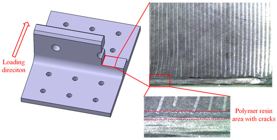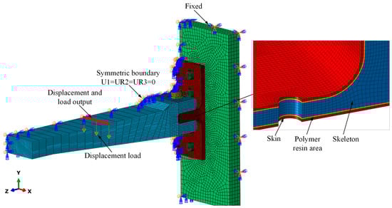 Finite element models were established by using ABAQUS 2021 commercial software to analyze the stress distribution and corresponding failure mechanisms of the novel polymer composite bolted T-joint under a bending load. As mentioned earlier, there exists a layer of 6068 epoxy resin area between the skin and skeleton of the composite T-joint, with a nominal thickness of 0.3 mm. In addition, although the bonding interfaces between the composite materials and polymer resin adhesive play a significant role in the connection effectiveness and mechanical properties [23,24], as shown in Figure 8, the experimental results indicate that the failure of the resin area itself leads to the final separation of the skin and skeleton. Additionally, adding two layers of cohesive units between the skin, skeleton, and resin area would greatly increase the difficulty of the model convergence. Therefore, a layer of resin element was established between the skin and skeleton to represent the resin area and the bonding interfaces were assumed to be perfectly bonded.