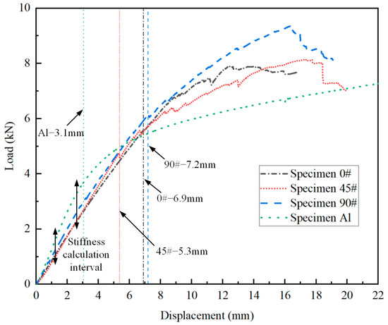 The load–displacement curves obtained from the tests are presented in Figure 10, with the maximum displacement corresponding to significant load changes annotated on the curves. The bending stiffness of each joint is calculated using the linear segments of the data, and the load at which significant load changes occur is taken as the yield limit load for each joint. For the composite T-joints, the maximum load from the load–displacement curve is considered the ultimate load. The test results are summarized in Table 4. It is observed that before plastic deformation occurs in the aluminum T-joint, the bending stiffness of the composite T-joint is lower than that of the aluminum one, but the yield limit load of the composite T-joint is significantly higher than that of the aluminum one. Comparing the test results of specimen Al and Specimen 90#, the bending stiffness of the composite T-joint is 0.81 times that of the aluminum one, while the yield limit load is 1.65 times higher, with the weight being only 55.4% of the aluminum one. Clearly, the novel polymer composite bolted T-joint exhibits an excellent bending performance.