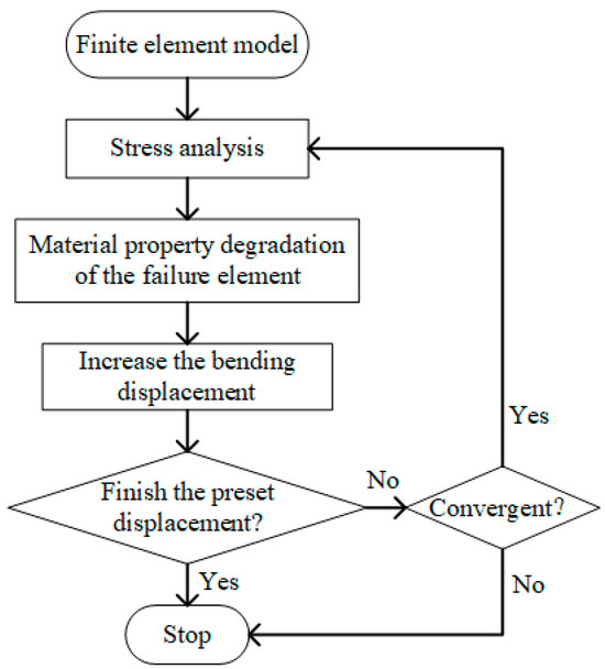 In finite element models, as soon as the failure is reached, the material properties of the failed elements need to be degraded based on the material property degradation rules [33]. To ensure the convergence of the model, the value of the material property after degradation should not be too small. In this investigation, the material property degradation rules for the composite bolted T-joint are shown in Table 5. Cheng et al. [14,15] utilized these material property degradation rules to numerically study the bending performance of a composite bolted π-joint and obtained highly accurate simulation results. The corresponding user subroutine USDFLD was developed to implement the determination of element failure and material property degradation. The computational process of the finite element model is illustrated in Figure 12.