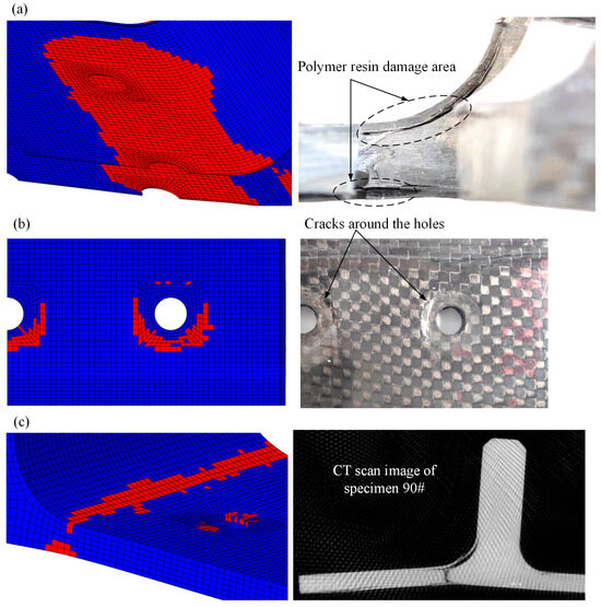 Comparison of numerical and experimental damage morphologies: polymer resin damage between skin and skeleton (a), skin damage area around the hole (b), and skeleton damage area along the thickness (c).
