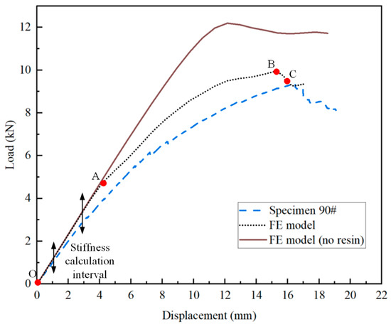 Load–displacement curves for specimen 90# by experimental and numerical analysis. (For Points O–C: O is the starting point, A is the damage initiation point, B is the ultimate load point and C is a point in the final destruction process).