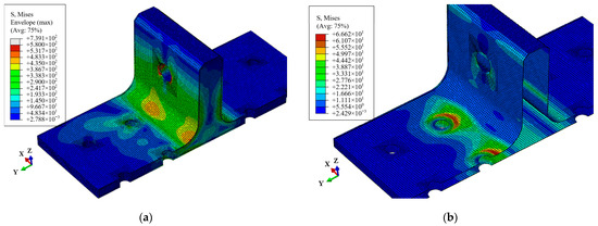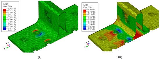 Shear stress distribution of the polymer resin area at point A: shear stress S13 (a) and shear stress S23 (b).