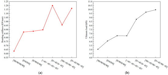 Variation in mechanical properties with the stacking sequence of the skeleton: bending stiffness (a) and ultimate load (b).