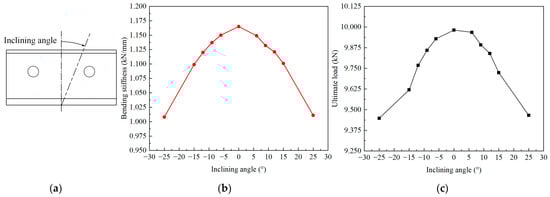Diagram of inclining angle (a). Variation in mechanical properties with the change in the inclining angle of the layer in the skeleton: bending stiffness (b) and ultimate load (c).