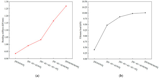 Variation in mechanical properties with changes in the stacking sequence of the skin: bending stiffness (a) and ultimate load (b).