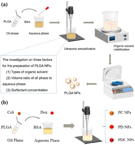 Herein, the effects of three types of organic solvents, various concentrations of surfactant, and volumes of aqueous phase on PLGA NPs were investigated using the sonicated-emulsified solvent evaporation method. Initially, the organic phase containing PLGA was dropwise added into the aqueous phase containing the surfactant (bovine serum albumin, BSA). BSA is an ionic surfactant and is very stable in the physiological environment, so it is suitable for use in the biomedical field. In addition, there are many chemical groups on BSA, and the use of modification is also more conducive to the loading of hydrophilic drugs. Then, the emulsion acquired via sonication was diluted and mixed to obtain a volatilizing organic solvent (Figure 1a). The size, zeta potential, and other physiochemical characteristics of PLGA NPs were determined to confirm the relevant parameters for the sonicated-emulsified solvent evaporation method. Afterward, to co-load hydrophilic and hydrophobic drugs, celecoxib (Ceb) was dissolved in the organic phase, whilst doxorubicin hydrochloride (Dox) was dissolved in the aqueous phase during the preparation of PLGA NPs. Ceb was physically mixed with PLGA and loaded into the nanoparticles, while Dox was loaded into the nanoparticles via electrostatic interactions and π-π conjugation with BSA (Figure 1b). Moreover, the oil–water partition coefficients of Dox and Ceb were 1.50 and 4.21, respectively. Following this, drug release behaviors were monitored under different acidic conditions to simulate the physiological and lysosomal environments. Moreover, the physiochemical characteristics of drug-loading PLGA nanoparticles were also examined.