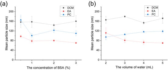 The size of PLGA NPs prepared in different organic phases (DCM, EA, and PC) through the emulsified solvent evaporation method under (a) various BSA concentrations and (b) various volumes of water phase.