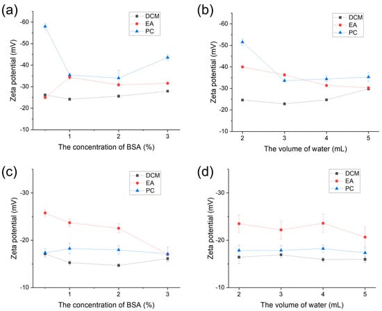 Zeta potential of PLGA NPs prepared in different organic phases (DCM, EA, and PC) through the emulsified solvent evaporation method (a) under various BSA concentrations and (b) various volumes of aqueous phase dispersed in water and PBS (c,d).