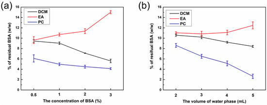 (a) The residual rate of BSA in PLGA NPs with the various volumes of water phase and different organic phases (DCM, EA, and PC) with a 1% fixed concentration of BSA. (b) The residual rate of BSA in PLGA NPs with the various concentrations of BSA and different organic phases (DCM, EA, and PC) with 4 mL fixed volume of water phase.