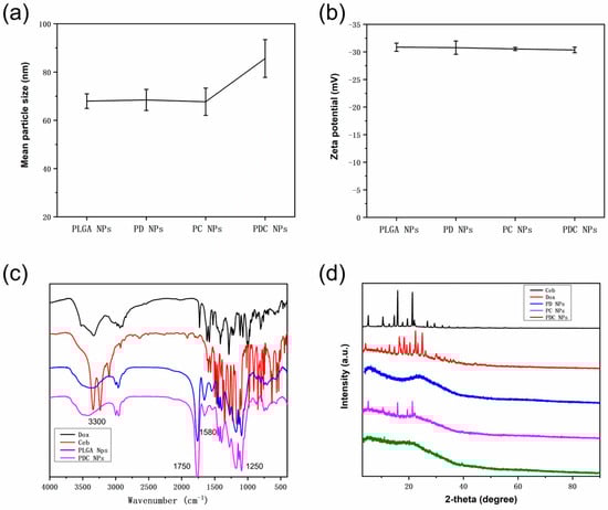 (a) Size, (b) zeta potential, (c) FTIR spectrum, and (d) XRD pattern of PLGA NPs, PD NPs, PC NPs, and PDC NPs.