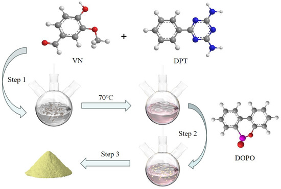 Figure 1 depicts the synthesis method of VDPD, which was carried out by using a one-pot method. DPT (7.5 g, 0.04 mol), vanillin (12.16 g, 0.08 mol), and anhydrous ethanol (200 mL) were placed in a 500 mL, three-neck, round-bottom flask fitted with a condenser, stirrer, and thermometer, and the reaction was carried out at 70 °C for 6 h. Then, DOPO (17.22 g, 0.08 mol) was added to the mixture and stirred, and the reaction was allowed to continue for 24 h at 80 °C. Afterwards, the reaction mixture was allowed to cool to room temperature. The obtained precipitate was filtered, followed by washing with hot water (80 °C) and toluene. Subsequently, the obtained product was dried in a vacuum oven at 80 °C for 24 h to remove the residual solvent, yielding a light yellow solid product (yield: 86%). The operation steps are shown in Figure 2.