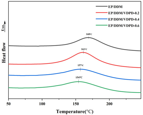 Differential scanning calorimetry (DSC) was used to investigate the curing behavior of the EP. As shown in Figure 5, each DSC curve presents only one exothermic peak. The exothermic peak of the EP was attributed to the addition reaction between the epoxy group and the amino group. The ring-opening reaction between the epoxy group, the amino group, and the hydroxyl group could be ascribed to the exothermic peak of the FREP. The peak temperature of EP/DDM was 168 °C, and, with the gradual addition of VDPD, the peak temperature of EP/DDM/VDPD-0.6 decreased to 154 °C, which indicates that VDPD can react with epoxy groups and improve the curing reaction activity of the curing system. For accuracy, the apparent activation energy was calculated using the more accurate Starink method [38,39]. The equation is as follows: