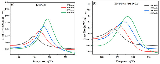 DSC curves of EP/DDM (a) and EP/DDM/VDPD-0.6 (b) at different heating rates.